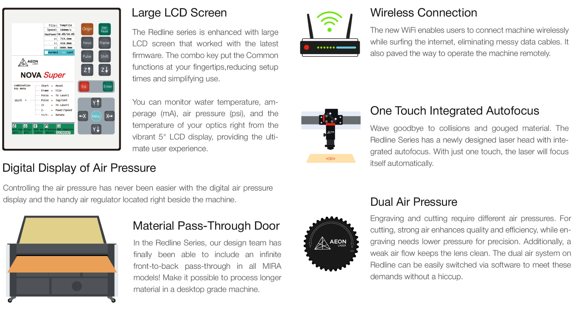If space is of concern, you’ll be pleased to know that Aeon is the first in the laser industry to offer an all-in-one solution comprised of an integrated water cooling system, exhaust fan, and air assist pump so that no extra space is needed for ancillary components, minimize the footprint of the machine and make your workspace neat and more organized.