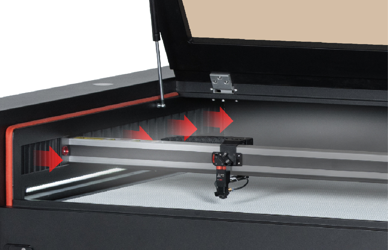 The Super Clean Pack design goes beyond the basics, enclosing the linear rails and bearing blocks for added protection. Additionally, protective curtains on the left and right side rails prevent unwanted particles from spreading beyond the work area, significantly prolonging the lifespan of the rails and greatly enhancing cutting and engraving quality.
